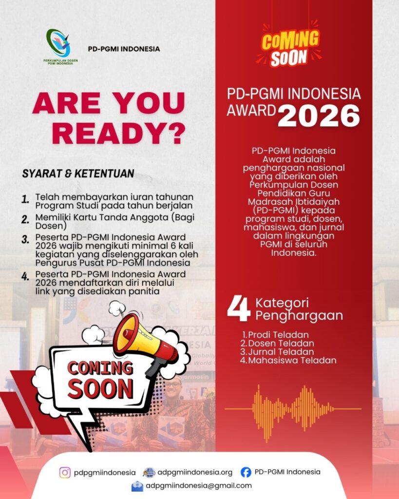 Bapak ibu Dosen PGMI Indonesia yang baik hati dan selalu Bahagia dimanapun berada, PD-PGMI Indonesia adalah tempat para akademisi bidang pendidikan dasar yang berjuang dan berkontribusi dalam penguatan kelimuan bagi guru-guru Madrasah Ibtidaiyah, PD-PGMI Indonesia ingin menyampaikan informasi singkat tentang Persiapan untuk Pengajuan bagi calon Penerima AWARD PD-PGMI Tahun 2026 yang Insyallah bersamaan dengan MUKERKNAS ke-12 di UNISMA (Universitas Islam Malang). Informasi terbarukan dari PD-PGMI, dan silahkan membaca dan memperhatikan syarat dan ketentuannya didalam FLIER, dan salah satunya termasuk : WAJIB MENGIKUTI MINIMAL 6 kali Kegiatan yang diselenggarakan oleh PD-PGMI, atas perhatian dan kerjasamanya, diucapkan terimakasih. Salam sehat-bahagia-sukses selalu,.