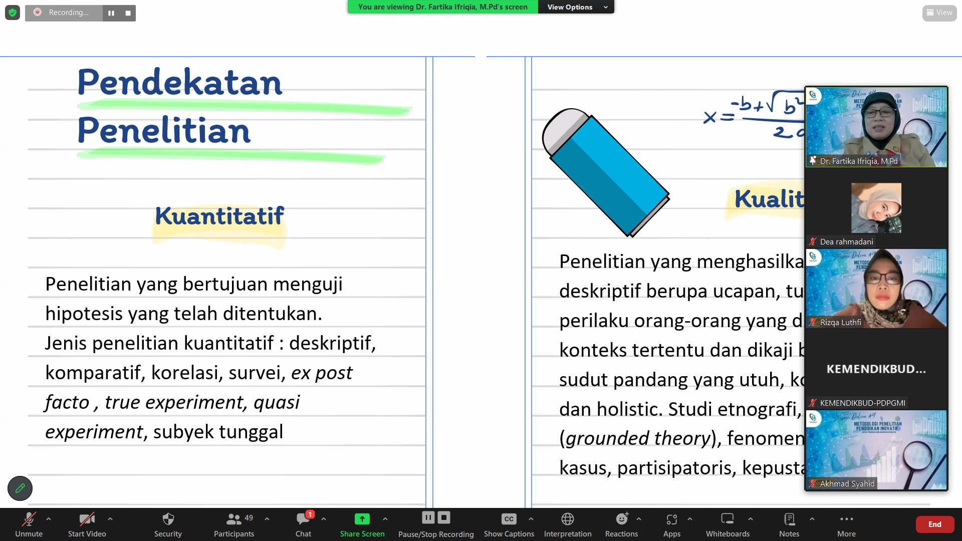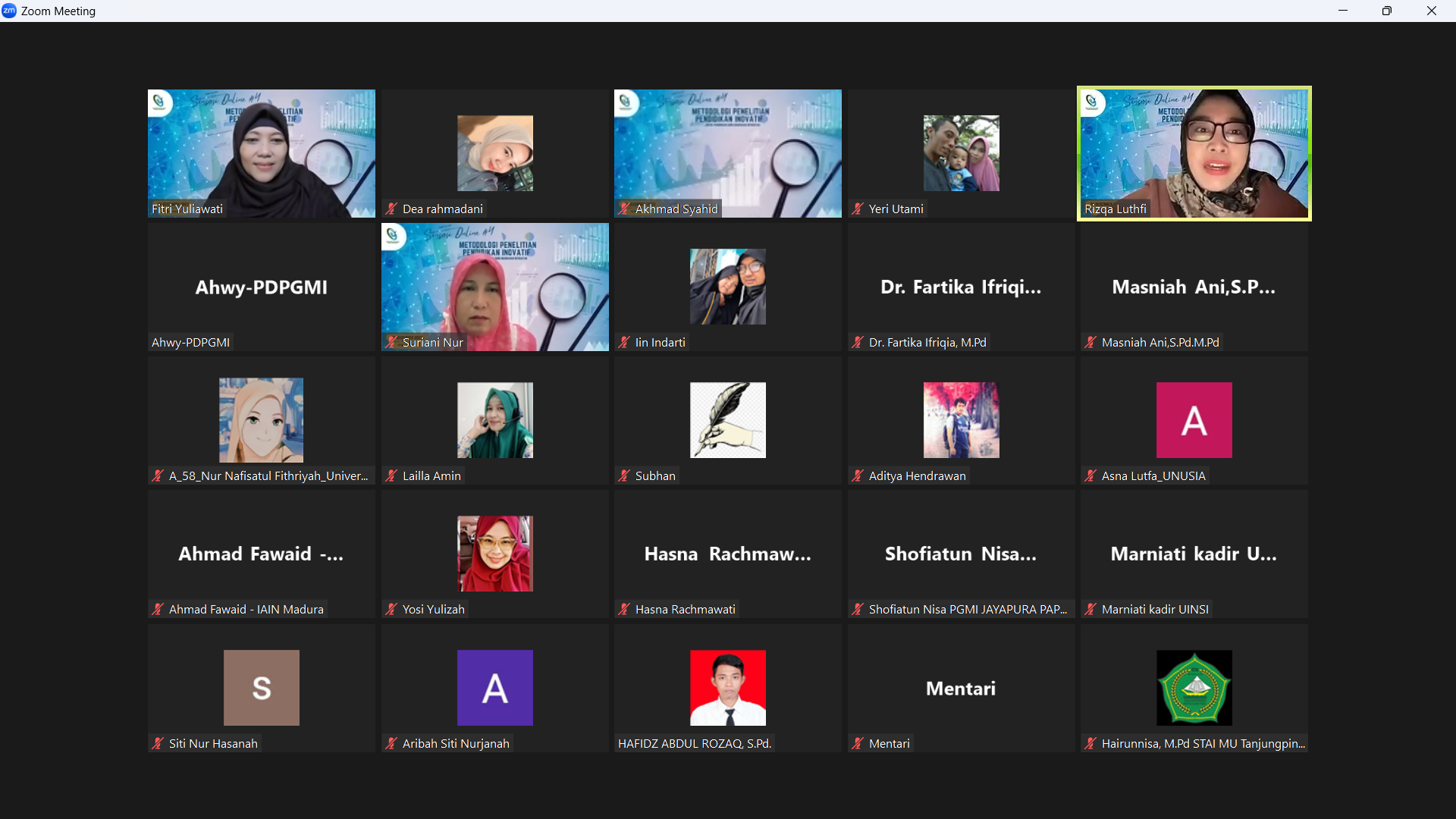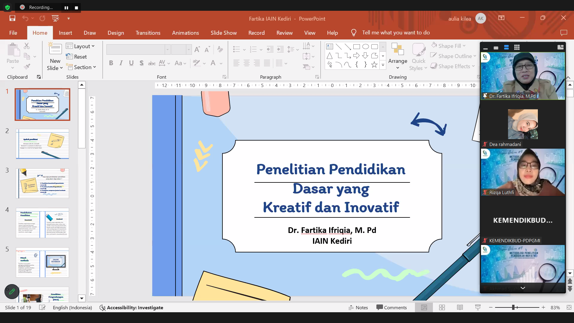 Kegiatan ini dipandu oleh moderator kita yaitu Ibu Nurluthfi Rizqa Heriningtyas, M.Pd dari UIN Syarif Hidayatullah Jakarta. Dalam edisi ke-4 ini, Sensasi Online mengangkat tema penting, yaitu “Metodologi Penelitian Pendidikan Inovatif untuk Pendidikan Guru Madrasah Ibtidaiyah.” Empat narasumber kelas dunia turut ambil bagian, masing-masing Dr. Fartika Ifriqia (IAIN Kediri), Ibu Lailla Hidayatul Amin, M.Pd.I., CLSP (IIM Surakarta), Bapak Ahmad Munawir, M.Pd. (IAIN Palopo), dan Ibu Dr. Suriani Nur, M.Si (IAIN Bone). Keempatnya memberikan wawasan mendalam seputar metodologi penelitian yang inovatif, menarik perhatian dosen, mahasiswa, dan peserta umum yang hadir.